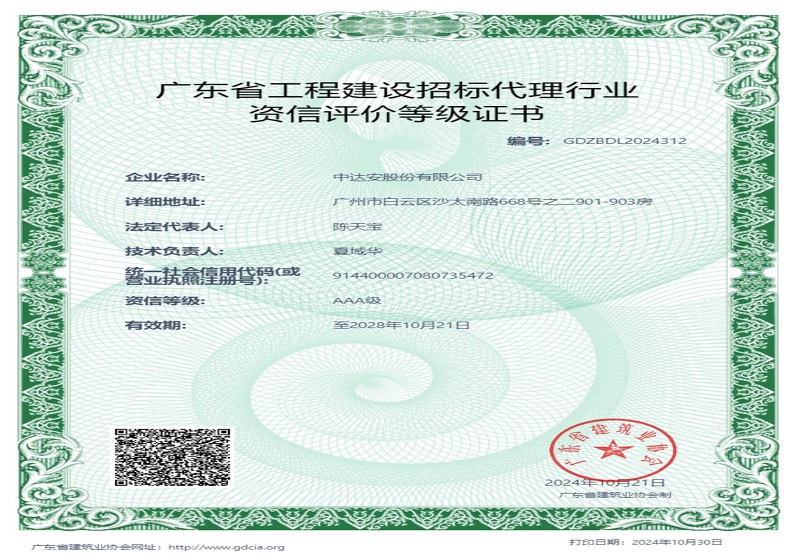 廣東省工程建設招標代理行業(yè)資信評價等級AAA級